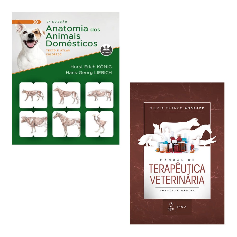 KIT 2 LIVROS: ANATOMIA DOS ANIMAIS DOMÉSTICOS: Best seller internacional, autores reconhecidos, qualidade das mais de 1.100 imagens que ilustram texto didático e objetivo. Além disso, a obra facilita a compreensão da anatomia aplicada a contextos clínicos. Nesta edição, um novo capítulo sobre anatomia das aves completa a obra. MANUAL DE TERAPÊUTICA VETERINÁRIA: Consulta Rápida abrange os princípios ativos de A a Z, com exemplos de nomes comerciais e suas principais características farmacológicas, além de tabelas de doses para cães, gatos, ruminantes, equinos, suínos, aves, coelhos, hamsteres e ferretes.