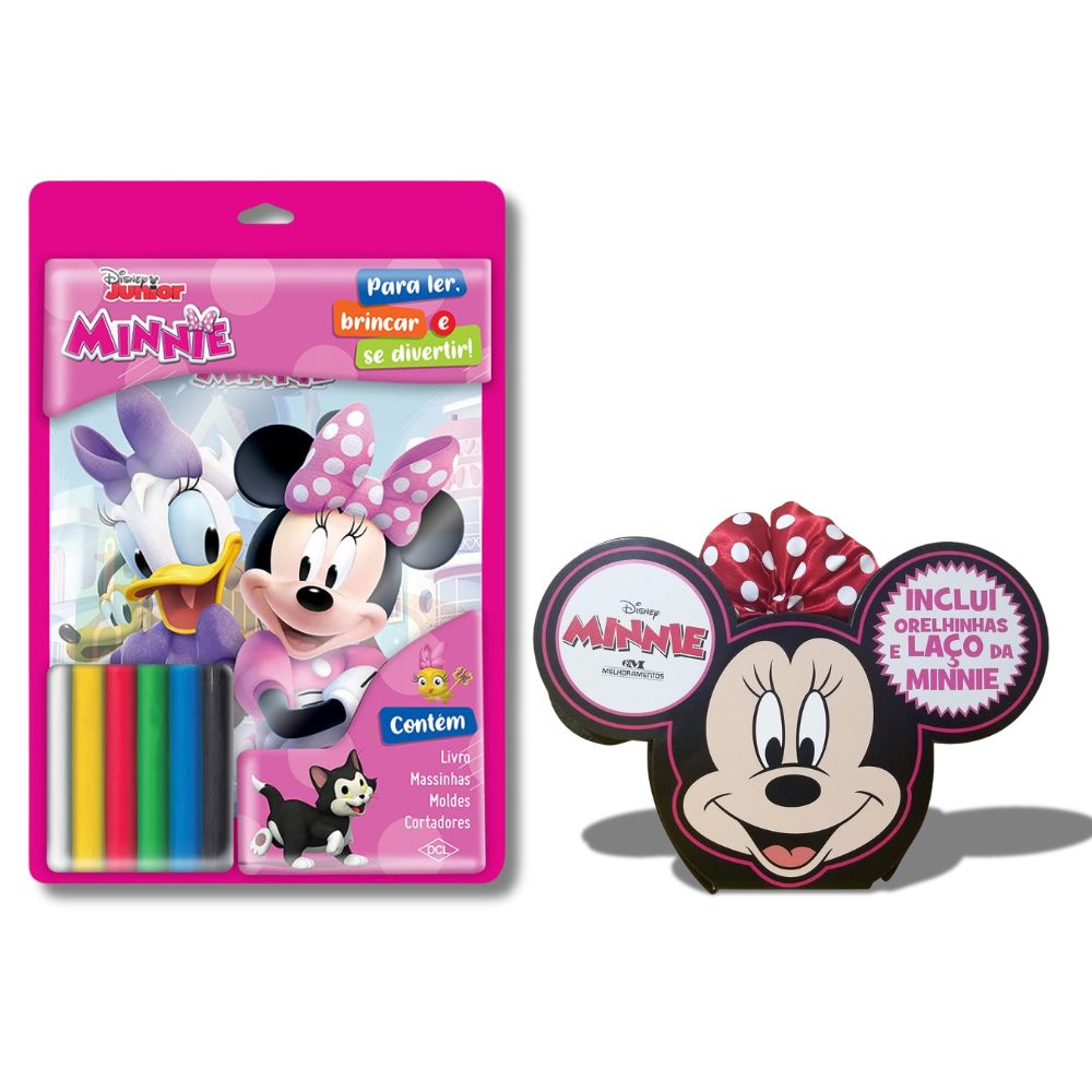 Uma explosão de diversão e criatividade com a Minnie e sua amiga Margarida! Neste kit especial, as crianças vão conhecer curiosidades sobre a Minnie e seus amigos em um livro ilustrado superdivertido, que ainda acompanha orelhinhas e um laço para brincar. E a brincadeira não para por aí: o blister de atividades vem recheado com massinhas coloridas, cartelas de adesivos, cortadores e um livro para colorir e se divertir ainda mais. Leitura, criatividade e muita cor com a turma da Minnie!