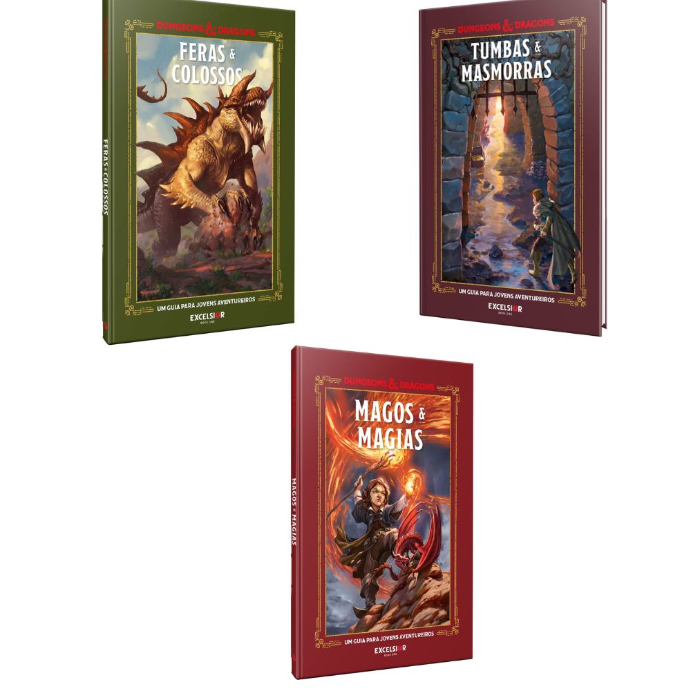 Dungeons & Dragons é uma série de guias ilustrados que ajudam jogadores e mestres a explorar o mundo mágico do RPG de mesa. O guia Feras e Colossos apresenta personagens, armas, ferramentas e criaturas gigantes, explicando suas habilidades e poderes mágicos e auxiliando novos jogadores a criar aventuras épicas e enfrentar desafios colossais. Tumbas e Masmorras leva os leitores a explorar locais perigosos, mostrando covis letais, as criaturas que os habitam e ensinando a construir masmorras próprias. Cada página estimula a imaginação e ajuda a criar histórias de heroísmo e aventura. O guia de Magia e Criadores místicos explora magos, magias e itens mágicos, oferecendo ferramentas para criar personagens únicos e heroicos, tornando cada aventura singular. Com ilustrações detalhadas e explicações claras, esses guias inspiram os jogadores a desenvolver personagens singulares, enfrentar monstros e construir jornadas épicas dentro do mundo de Dungeons & Dragons.