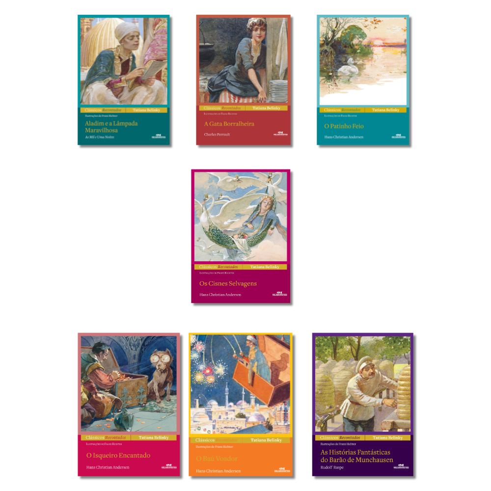 Sete histórias clássicas repletas de magia, aventura e lições inesquecíveis. Aladim vive uma grande aventura ao enfrentar um feiticeiro para conquistar a misteriosa lâmpada maravilhosa. Cinderela, mesmo sofrendo com a madrasta e as irmãs, mantém a bondade e a esperança de que sua vida pode mudar. O Patinho Feio embarca em uma jornada emocionante até descobrir seu verdadeiro valor. Elisa enfrenta grandes desafios para libertar seus irmãos transformados em cisnes por um feitiço. Um corajoso soldado encontra um isqueiro mágico que pode mudar seu destino e ajudá-lo a conquistar o amor de uma princesa. Um jovem aventureiro descobre um baú voador que o leva a terras distantes e a um encontro inesperado com uma princesa. E o Barão de Munchausen encanta com suas histórias exageradas, divertidas e cheias de imaginação. Uma coletânea encantadora que reúne contos cheios de fantasia, coragem e descobertas. Livros da coleção: Aladim e a Lâmpada Maravilhosa Cinderela O Patinho Feio Os Cisnes Selvagens O Isqueiro Mágico O Baú Voador As Aventuras do Barão de Munchausen