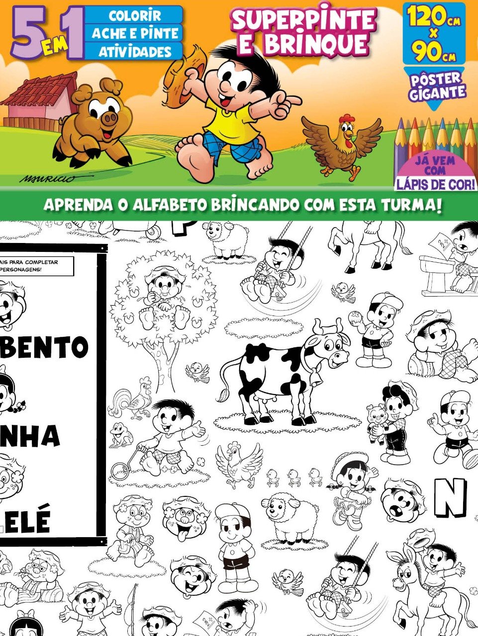 Chico Bento e seus amigos esperam em um pôster gigante de 1.20m x 90cm para você se divertir de montão com muitas atividades e mais de 500 figuras para pintar! Ainda acompanha lápis de cor para completar a diversão!