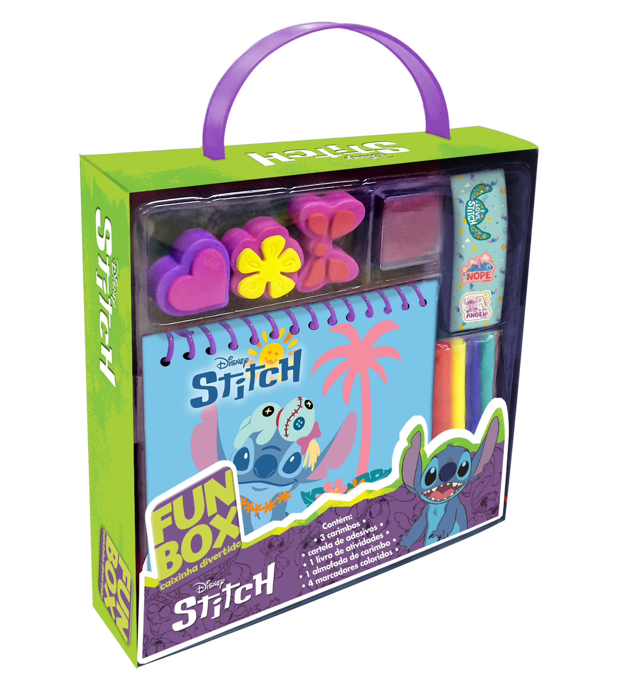 Divirta-se com esta caixa cheia de atividades e desenhos para colorir os personagens do Stitch. Inclui 3 carimbos; cartela de adesivos; 1 livro de atividades; 1 almofada de carimbo e 4 marcadores coloridos.