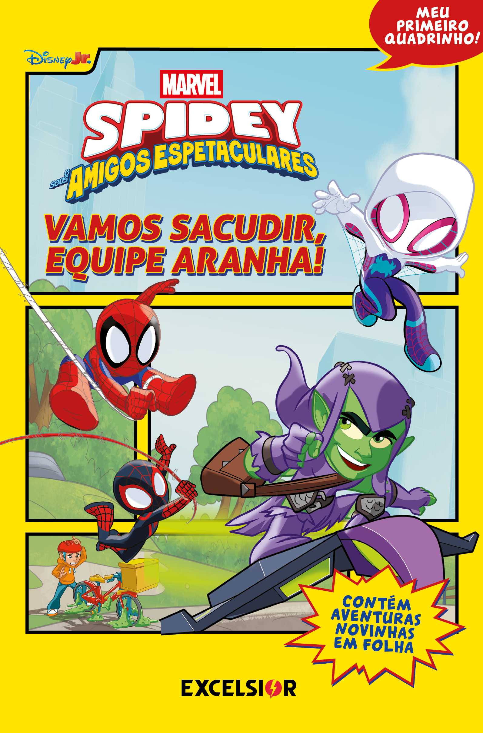 Preparem suas teias! Aranha, Aranha-Fantasma e Spin saltam para derrotar os vilões. E, dessa vez, contam com uma ajudinha de seus amigos Pantera Negra, Hulk e Ms. Marvel! As histórias de Meu primeiro quadrinho são escritas para crianças entre 5 e 8 o ito anos, que estão lendo por conta própria. Essas histórias contêm diagramações fáceis de acompanhar e texto adequado para a idade. Esta é uma história de nível 1, pensada para idades entre 5 e 7 anos. Esta é uma revista para leitores iniciantes, pe nsada para crianças.
