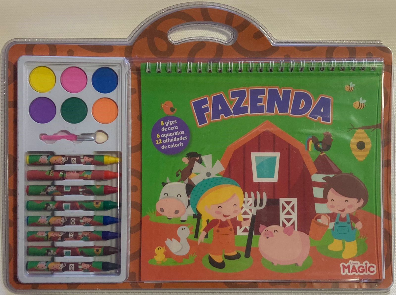 Kids composto por 1 livro com 12 páginas, mais 8 lápis de cera e aquarela de 6 cores com pincel.