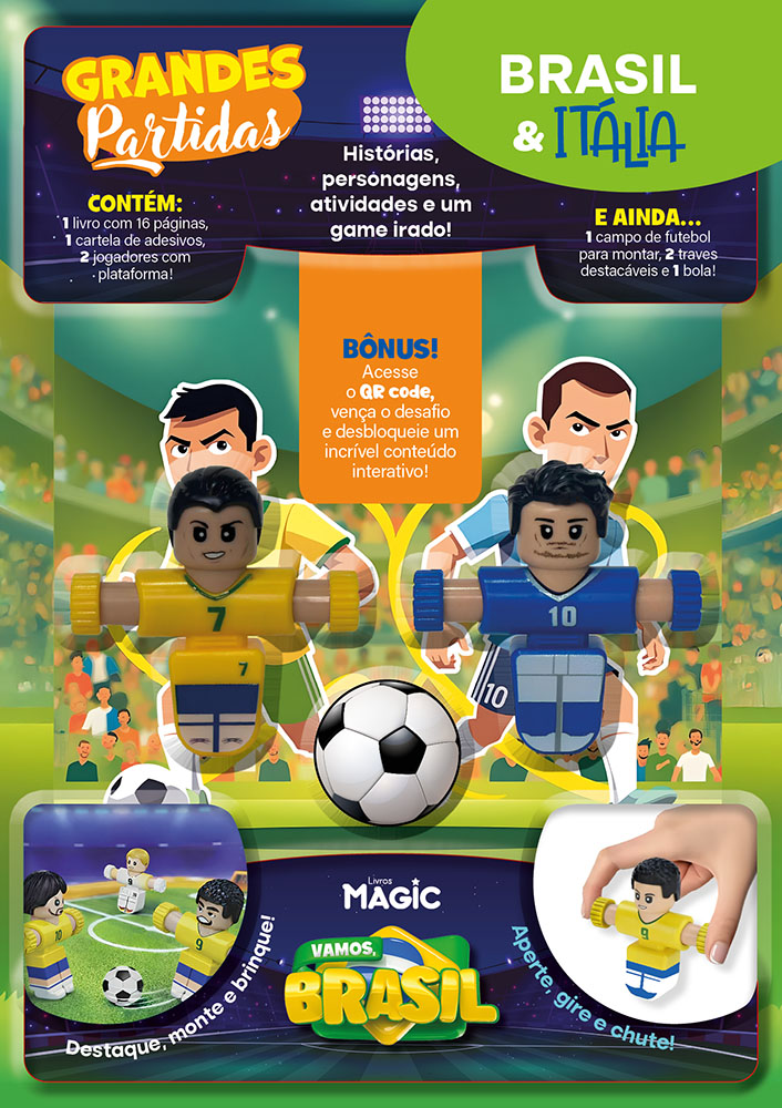 A tradição e a paixão pelo futebol se encontram em Futebol Brasil x Itália! Este kit completo acompanha um livro de 16 páginas, 2 jogadores, dispositivo para lançar a bola, encarte que se transforma em campo e trave destacável, proporcionando partida s emocionantes e cheias de diversão. Um jogo interativo perfeito para pequenos craques viverem grandes duelos!